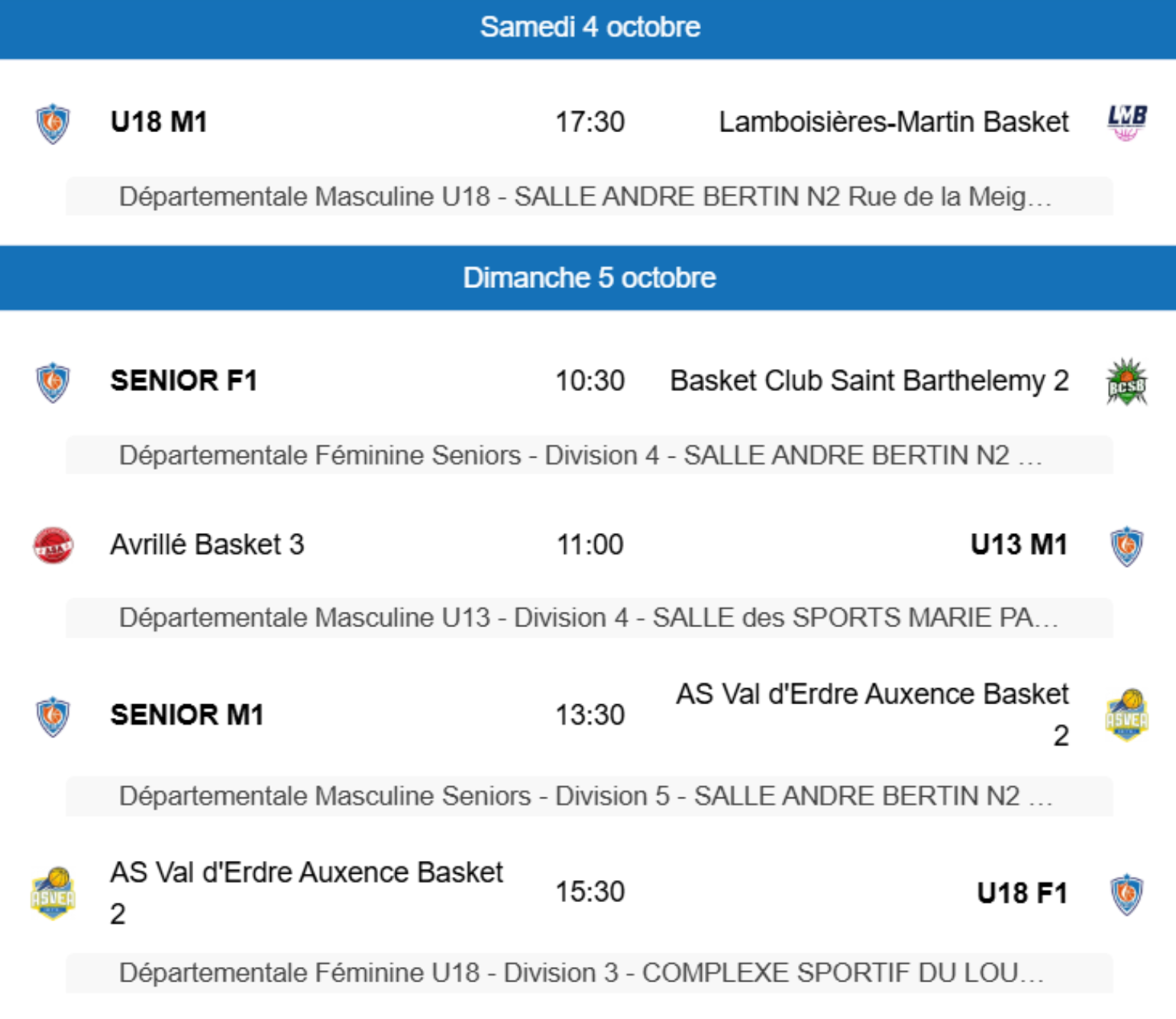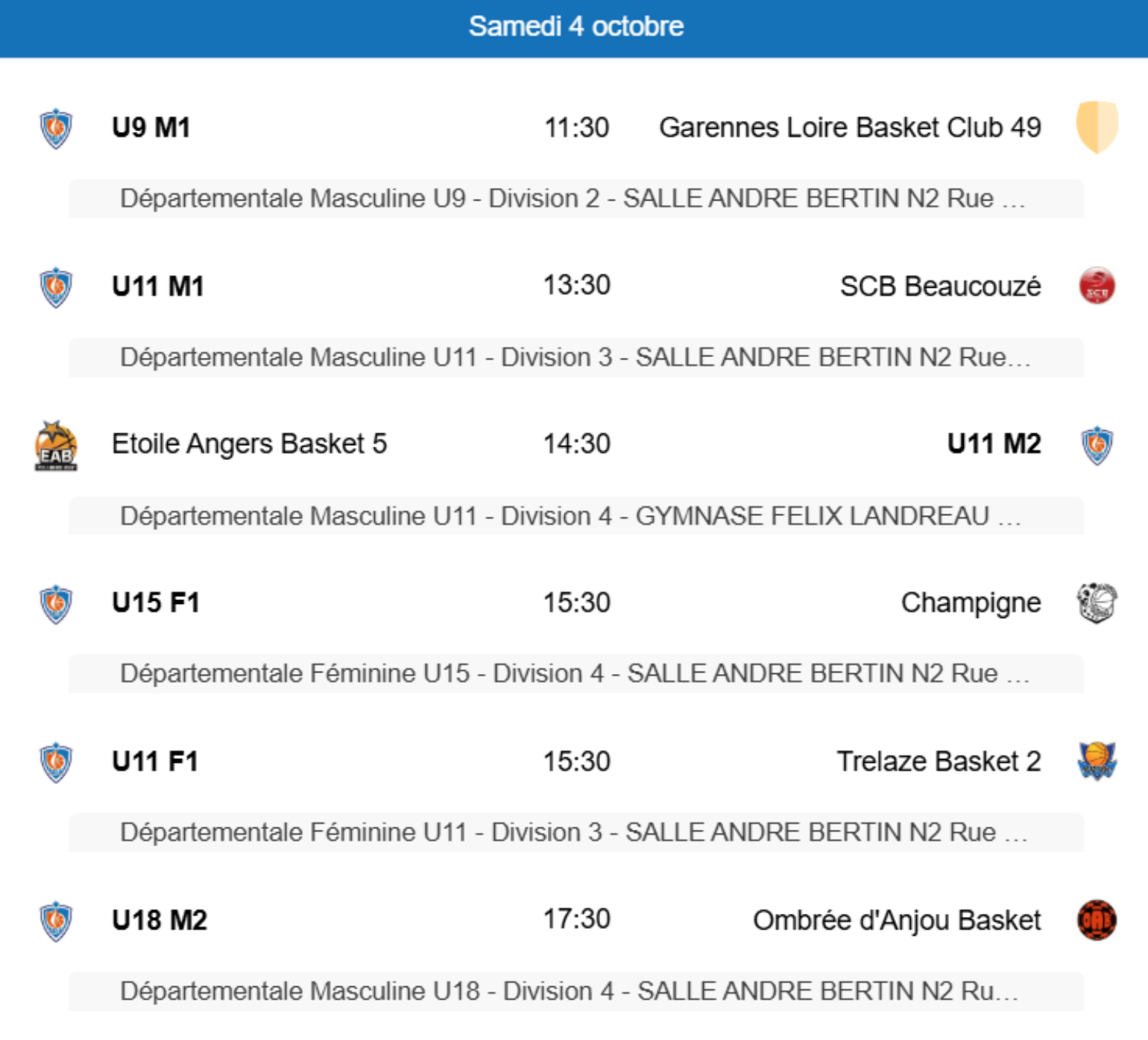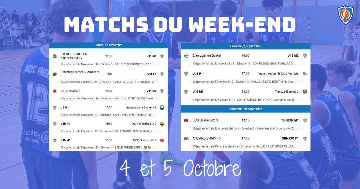 Nos U9M, U13M, U15F, U18F et U18M1 évolueront à domicile, tandis que nos U11F, U11M1, U11M2, U18M2, Seniors F et Seniors M se déplaceront à l’extérieur.